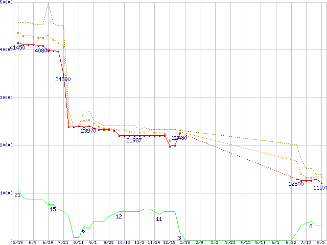 ※このグラフは過去のデータも税率5%相当に調整した税込み相当額のグラフです。 税率変更や、総額表示方式導入(2004年4月)の影響は除いています。 | | | ●凡例 | 最安値 (点線部は販売店未確認 または未調査) | 平均値 | 最高値 | ショップ数 |