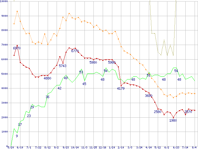 ※このグラフは過去のデータも税率5%相当に調整した税込み相当額のグラフです。 税率変更や、総額表示方式導入(2004年4月)の影響は除いています。 | | | ●凡例 | 最安値 (点線部は販売店未確認 または未調査) | 平均値 | 最高値 | ショップ数 |