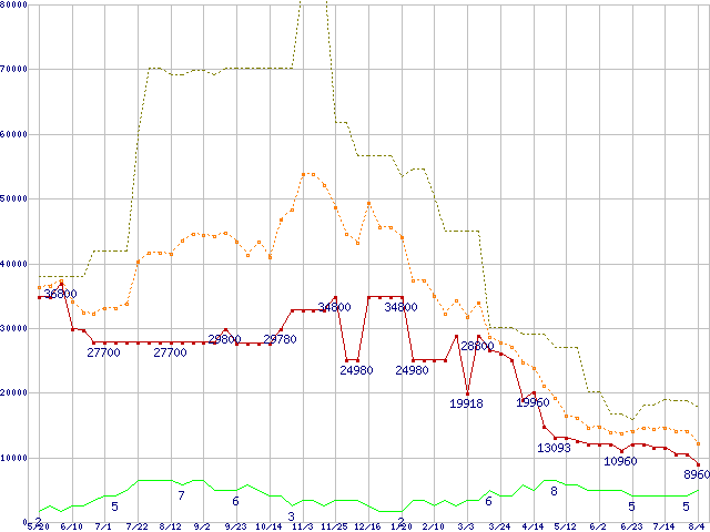 ※このグラフは過去のデータも税率5%相当に調整した税込み相当額のグラフです。 税率変更や、総額表示方式導入(2004年4月)の影響は除いています。 | | | ●凡例 | 最安値 (点線部は販売店未確認 または未調査) | 平均値 | 最高値 | ショップ数 |