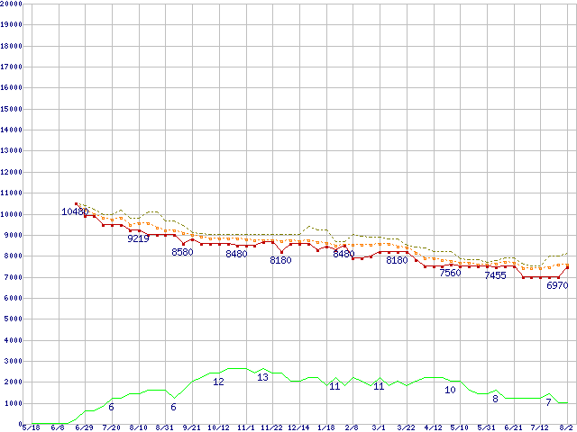 ※このグラフは過去のデータも税率5%相当に調整した税込み相当額のグラフです。 税率変更や、総額表示方式導入(2004年4月)の影響は除いています。 | | | ●凡例 | 最安値 (点線部は販売店未確認 または未調査) | 平均値 | 最高値 | ショップ数 |