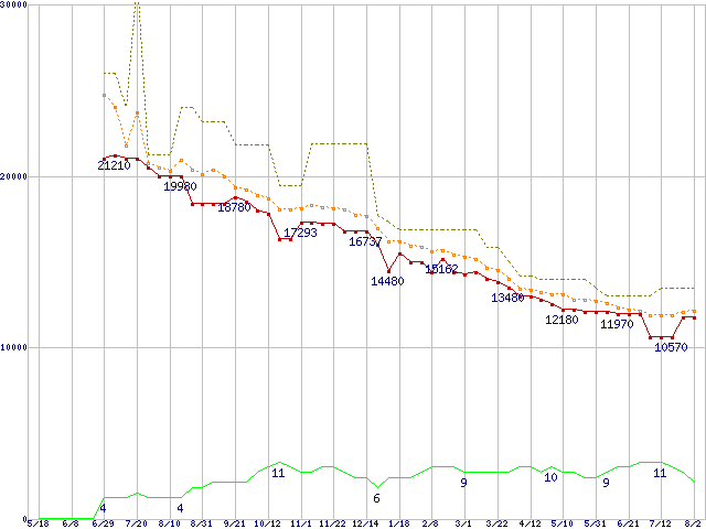 ※このグラフは過去のデータも税率5%相当に調整した税込み相当額のグラフです。 税率変更や、総額表示方式導入(2004年4月)の影響は除いています。 | | | ●凡例 | 最安値 (点線部は販売店未確認 または未調査) | 平均値 | 最高値 | ショップ数 |