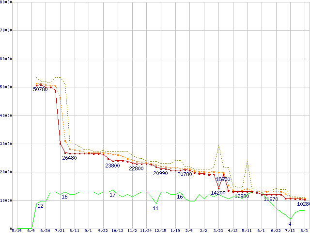 ※このグラフは過去のデータも税率5%相当に調整した税込み相当額のグラフです。 税率変更や、総額表示方式導入(2004年4月)の影響は除いています。 | | | ●凡例 | 最安値 (点線部は販売店未確認 または未調査) | 平均値 | 最高値 | ショップ数 |