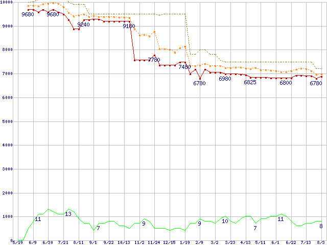 ※このグラフは過去のデータも税率5%相当に調整した税込み相当額のグラフです。 税率変更や、総額表示方式導入(2004年4月)の影響は除いています。 | | | ●凡例 | 最安値 (点線部は販売店未確認 または未調査) | 平均値 | 最高値 | ショップ数 |
