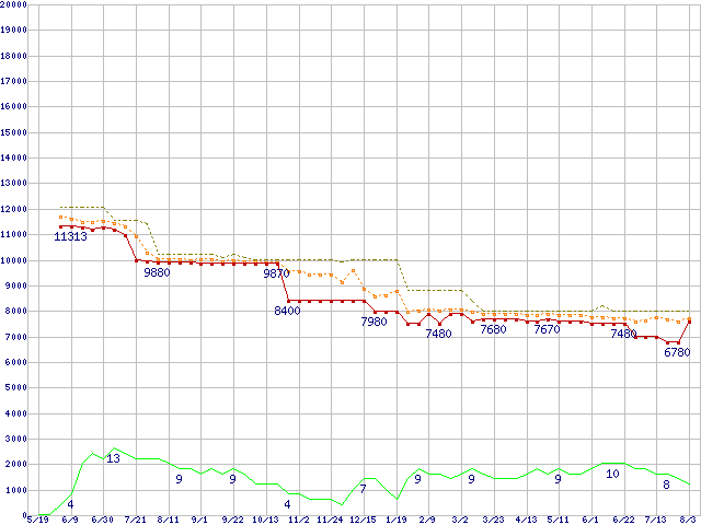 ※このグラフは過去のデータも税率5%相当に調整した税込み相当額のグラフです。 税率変更や、総額表示方式導入(2004年4月)の影響は除いています。 | | | ●凡例 | 最安値 (点線部は販売店未確認 または未調査) | 平均値 | 最高値 | ショップ数 |