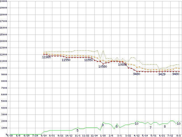 ※このグラフは過去のデータも税率5%相当に調整した税込み相当額のグラフです。 税率変更や、総額表示方式導入(2004年4月)の影響は除いています。 | | | ●凡例 | 最安値 (点線部は販売店未確認 または未調査) | 平均値 | 最高値 | ショップ数 |