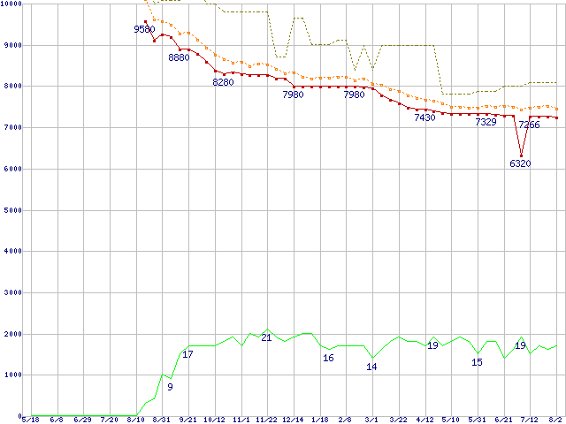 | HDT725025VLAT80 (250GB,8MB)の価格推移 | | | (2006年5月18日~2007年8月2日) |