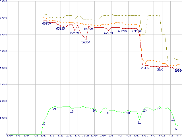 | Core 2 Duo E6700 (2.66GHz,L2 4MB)の価格推移 | | | (2006年5月19日~2007年8月3日) |