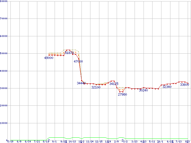 ※このグラフは過去のデータも税率5%相当に調整した税込み相当額のグラフです。 税率変更や、総額表示方式導入(2004年4月)の影響は除いています。 | | | ●凡例 | 最安値 (点線部は販売店未確認 または未調査) | 平均値 | 最高値 | ショップ数 |