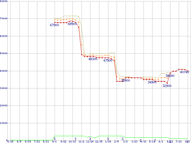 ※このグラフは過去のデータも税率5%相当に調整した税込み相当額のグラフです。 税率変更や、総額表示方式導入(2004年4月)の影響は除いています。 | | | ●凡例 | 最安値 (点線部は販売店未確認 または未調査) | 平均値 | 最高値 | ショップ数 |