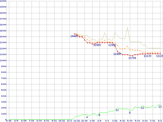 ※このグラフは過去のデータも税率5%相当に調整した税込み相当額のグラフです。 税率変更や、総額表示方式導入(2004年4月)の影響は除いています。 | | | ●凡例 | 最安値 (点線部は販売店未確認 または未調査) | 平均値 | 最高値 | ショップ数 |