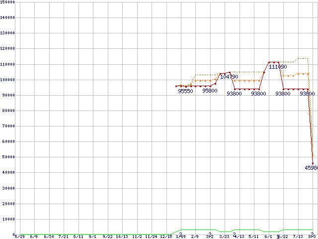 ※このグラフは過去のデータも税率5%相当に調整した税込み相当額のグラフです。 税率変更や、総額表示方式導入(2004年4月)の影響は除いています。 | | | ●凡例 | 最安値 (点線部は販売店未確認 または未調査) | 平均値 | 最高値 | ショップ数 |