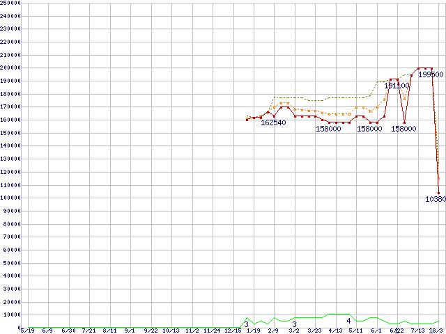 ※このグラフは過去のデータも税率5%相当に調整した税込み相当額のグラフです。 税率変更や、総額表示方式導入(2004年4月)の影響は除いています。 | | | ●凡例 | 最安値 (点線部は販売店未確認 または未調査) | 平均値 | 最高値 | ショップ数 |