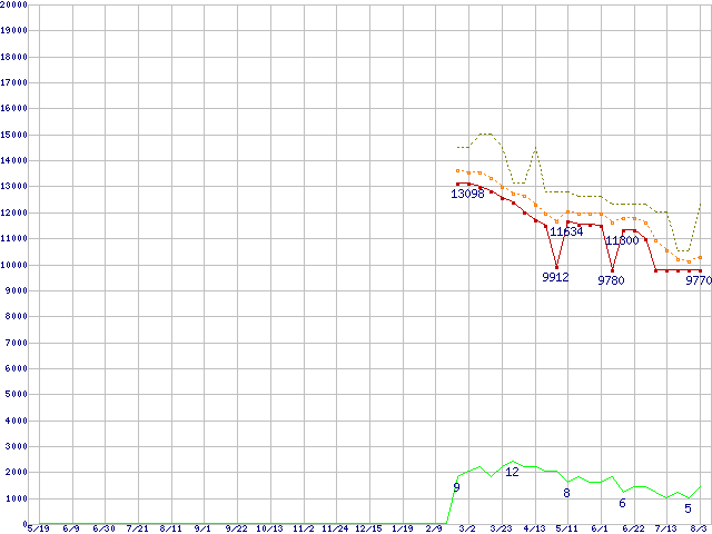 ※このグラフは過去のデータも税率5%相当に調整した税込み相当額のグラフです。 税率変更や、総額表示方式導入(2004年4月)の影響は除いています。 | | | ●凡例 | 最安値 (点線部は販売店未確認 または未調査) | 平均値 | 最高値 | ショップ数 |