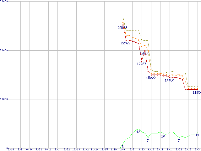 | Athlon 64 X2 4400+ (2.3GHz,L2 512KB×2,TDP65W)の価格推移 | | | (2006年5月19日~2007年8月3日) |