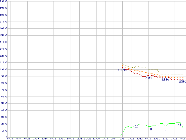 ※このグラフは過去のデータも税率5%相当に調整した税込み相当額のグラフです。 税率変更や、総額表示方式導入(2004年4月)の影響は除いています。 | | | ●凡例 | 最安値 (点線部は販売店未確認 または未調査) | 平均値 | 最高値 | ショップ数 |