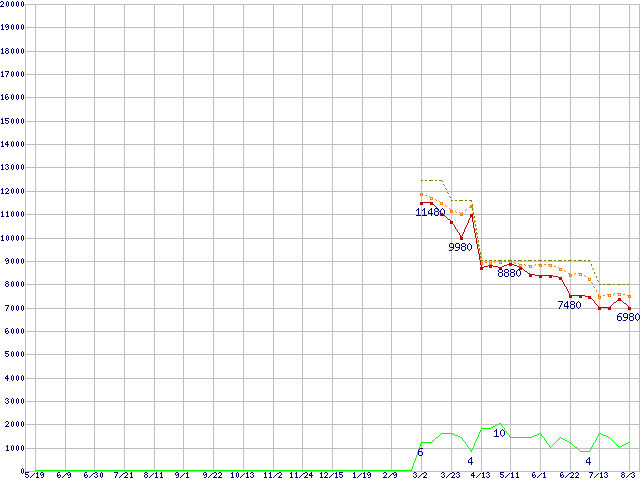 | Athlon 64 3500+ (2.2GHz,L2 512KB,TDP 45W)の価格推移 | | | (2006年5月19日~2007年8月3日) |