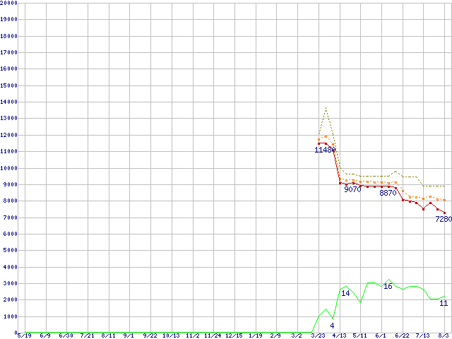 ※このグラフは過去のデータも税率5%相当に調整した税込み相当額のグラフです。 税率変更や、総額表示方式導入(2004年4月)の影響は除いています。 | | | ●凡例 | 最安値 (点線部は販売店未確認 または未調査) | 平均値 | 最高値 | ショップ数 |
