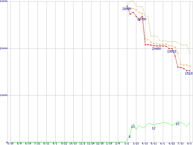 | Athlon 64 X2 5000+ (2.6GHz,L2 512KB×2,TDP65W)の価格推移 | | | (2006年5月19日~2007年8月3日) |