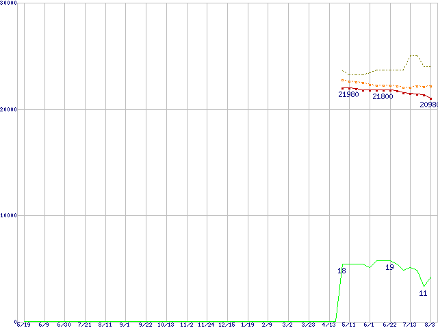 | Core 2 Duo E6320 (1.86GHz,L2 4MB)の価格推移 | | | (2006年5月19日~2007年8月3日) |