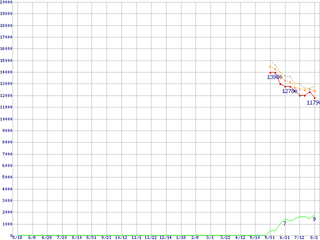 ※このグラフは過去のデータも税率5%相当に調整した税込み相当額のグラフです。 税率変更や、総額表示方式導入(2004年4月)の影響は除いています。 | | | ●凡例 | 最安値 (点線部は販売店未確認 または未調査) | 平均値 | 最高値 | ショップ数 |