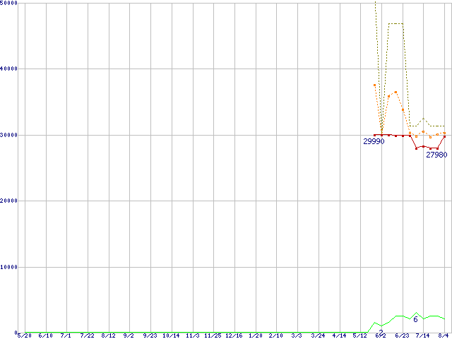 ※このグラフは過去のデータも税率5%相当に調整した税込み相当額のグラフです。 税率変更や、総額表示方式導入(2004年4月)の影響は除いています。 | | | ●凡例 | 最安値 (点線部は販売店未確認 または未調査) | 平均値 | 最高値 | ショップ数 |
