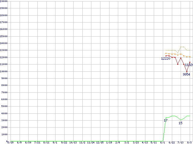 ※このグラフは過去のデータも税率5%相当に調整した税込み相当額のグラフです。 税率変更や、総額表示方式導入(2004年4月)の影響は除いています。 | | | ●凡例 | 最安値 (点線部は販売店未確認 または未調査) | 平均値 | 最高値 | ショップ数 |