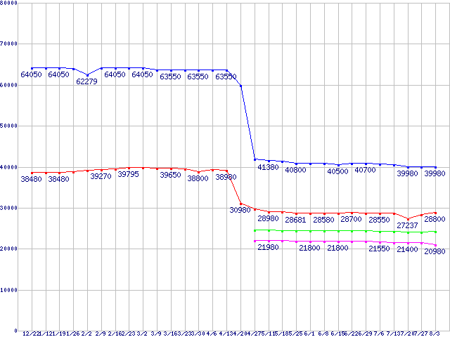 | LGA775 (FSB 1066MHz,Dual Core,EM64T対応,TDP 65W)の最安値推移 | | | (2006年12月22日~2007年8月3日) |