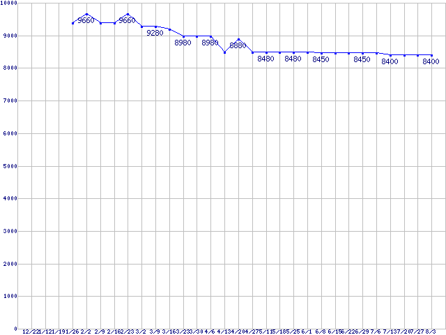 | LGA775 (FSB 800MHz,L2 2MB,Hyper-Threading,EM64T対応)の最安値推移 | | | (2006年12月22日~2007年8月3日) |