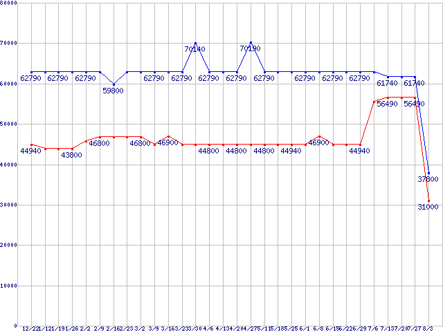 LGA771(FSB 1333MHz,Quad Core,L2 4MB×2,TDP 80W)の最安値推移