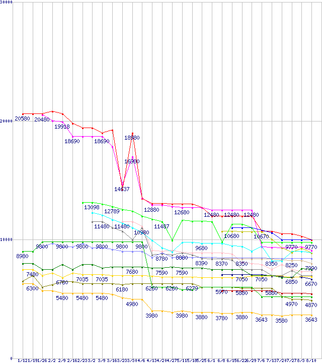 | CPU主要製品(最安値1万円未満)の最安値推移 | | | (2007年1月12日~2007年8月10日) |