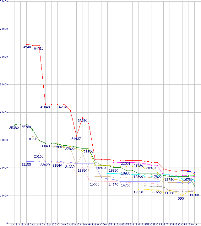 | CPU主要製品(最安値1万円~2万円未満)の最安値推移 | | | (2007年1月12日~2007年8月10日) |