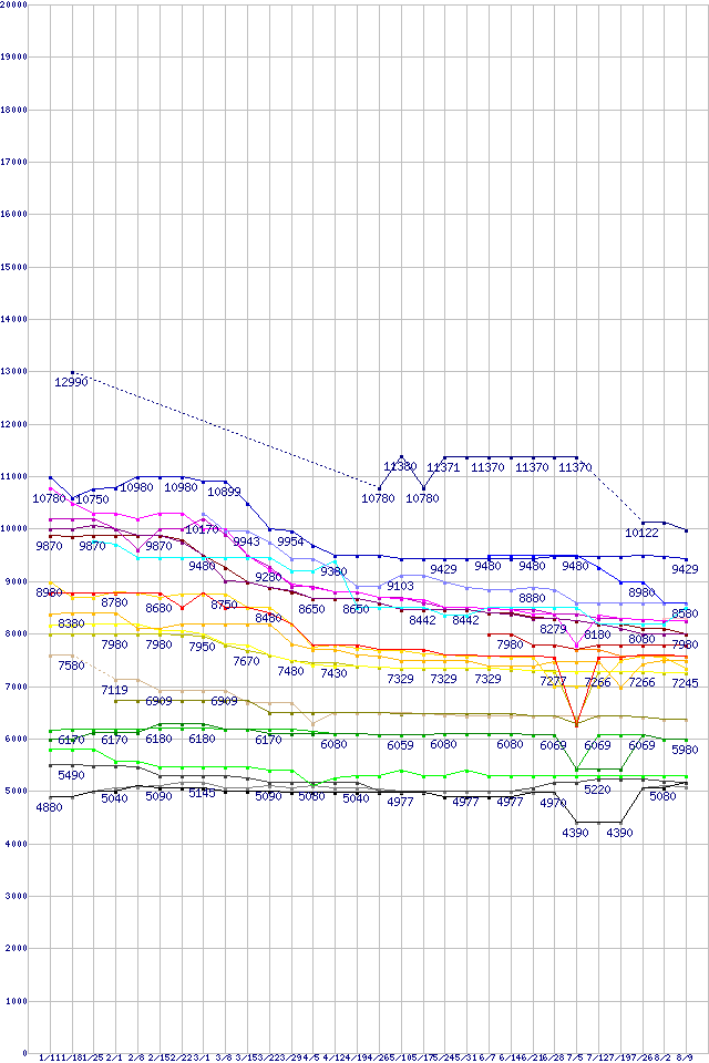 | HDD主要製品(最安値1万円未満)の最安値推移 | | | (2007年1月11日~2007年8月9日) |