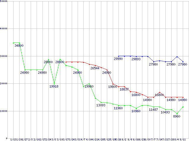 メモリ主要製品(最安値1万円以上)の最安値推移