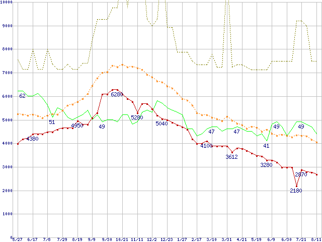 ※このグラフは過去のデータも税率5%相当に調整した税込み相当額のグラフです。 税率変更や、総額表示方式導入(2004年4月)の影響は除いています。 | | | ●凡例 | 最安値 (点線部は販売店未確認 または未調査) | 平均値 | 最高値 | ショップ数 |