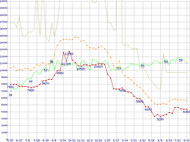 ※このグラフは過去のデータも税率5%相当に調整した税込み相当額のグラフです。 税率変更や、総額表示方式導入(2004年4月)の影響は除いています。 | | | ●凡例 | 最安値 (点線部は販売店未確認 または未調査) | 平均値 | 最高値 | ショップ数 |