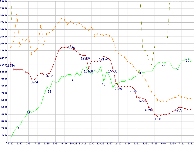※このグラフは過去のデータも税率5%相当に調整した税込み相当額のグラフです。 税率変更や、総額表示方式導入(2004年4月)の影響は除いています。 | | | ●凡例 | 最安値 (点線部は販売店未確認 または未調査) | 平均値 | 最高値 | ショップ数 |