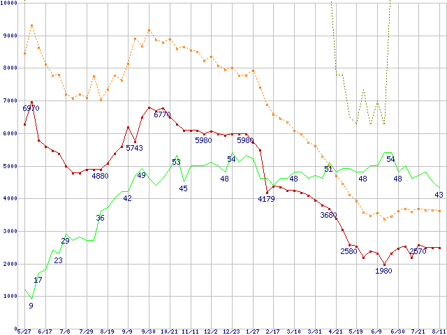 ※このグラフは過去のデータも税率5%相当に調整した税込み相当額のグラフです。 税率変更や、総額表示方式導入(2004年4月)の影響は除いています。 | | | ●凡例 | 最安値 (点線部は販売店未確認 または未調査) | 平均値 | 最高値 | ショップ数 |