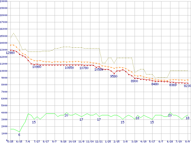 ※このグラフは過去のデータも税率5%相当に調整した税込み相当額のグラフです。 税率変更や、総額表示方式導入(2004年4月)の影響は除いています。 | | | ●凡例 | 最安値 (点線部は販売店未確認 または未調査) | 平均値 | 最高値 | ショップ数 |