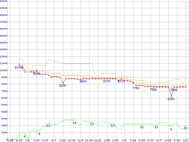※このグラフは過去のデータも税率5%相当に調整した税込み相当額のグラフです。 税率変更や、総額表示方式導入(2004年4月)の影響は除いています。 | | | ●凡例 | 最安値 (点線部は販売店未確認 または未調査) | 平均値 | 最高値 | ショップ数 |