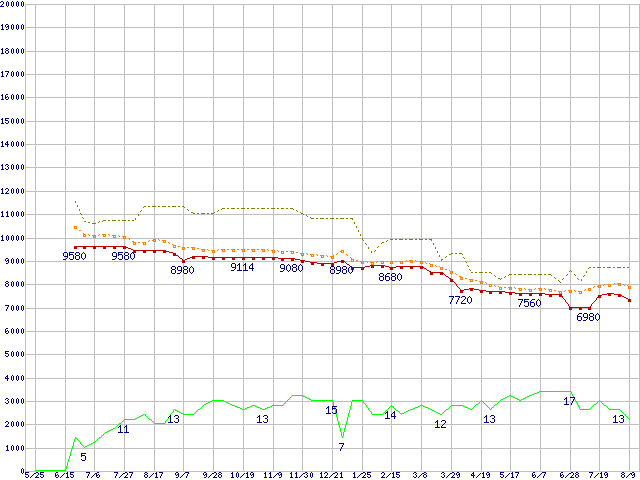※このグラフは過去のデータも税率5%相当に調整した税込み相当額のグラフです。 税率変更や、総額表示方式導入(2004年4月)の影響は除いています。 | | | ●凡例 | 最安値 (点線部は販売店未確認 または未調査) | 平均値 | 最高値 | ショップ数 |