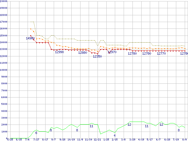 ※このグラフは過去のデータも税率5%相当に調整した税込み相当額のグラフです。 税率変更や、総額表示方式導入(2004年4月)の影響は除いています。 | | | ●凡例 | 最安値 (点線部は販売店未確認 または未調査) | 平均値 | 最高値 | ショップ数 |