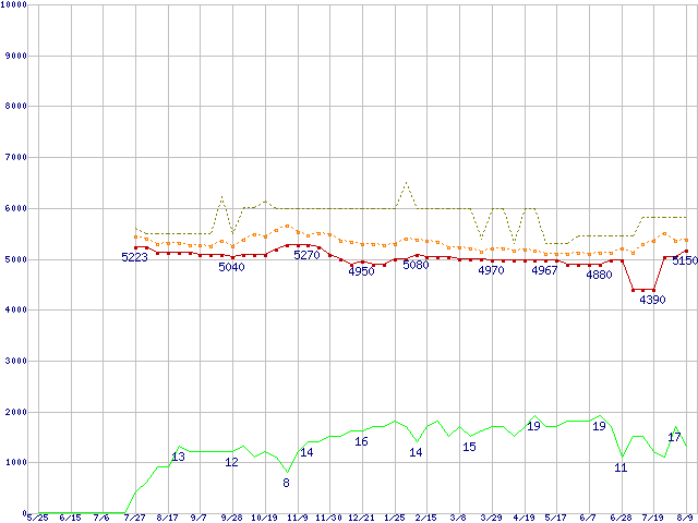 ※このグラフは過去のデータも税率5%相当に調整した税込み相当額のグラフです。 税率変更や、総額表示方式導入(2004年4月)の影響は除いています。 | | | ●凡例 | 最安値 (点線部は販売店未確認 または未調査) | 平均値 | 最高値 | ショップ数 |