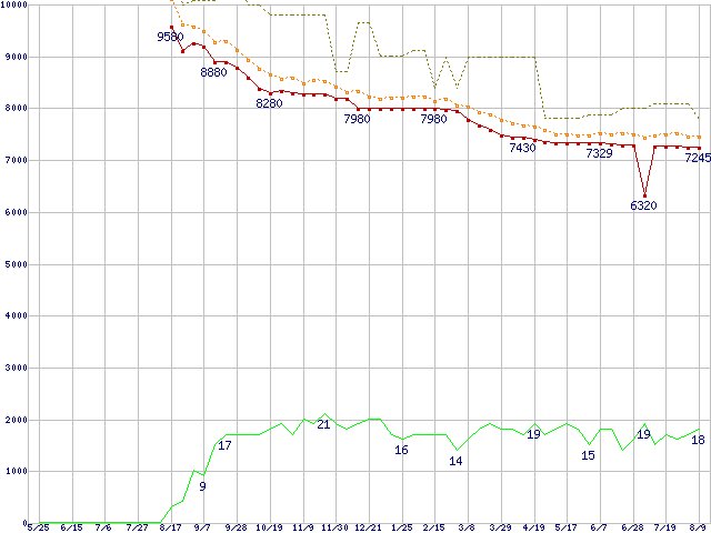 | HDT725025VLAT80 (250GB,8MB)の価格推移 | | | (2006年5月25日~2007年8月9日) |