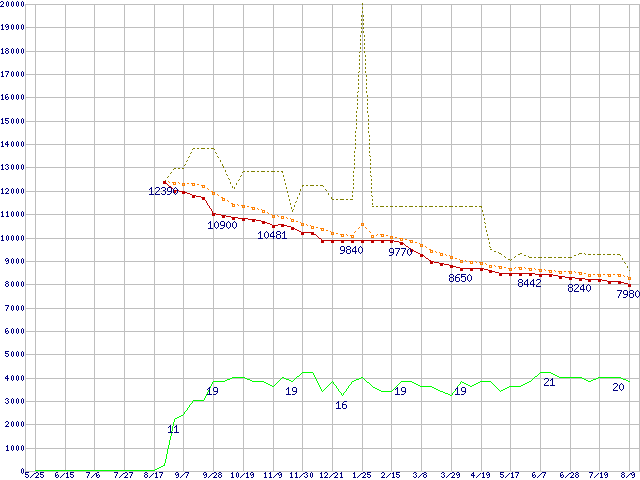 | HDT725032VLAT80 (320GB,8MB)の価格推移 | | | (2006年5月25日~2007年8月9日) |