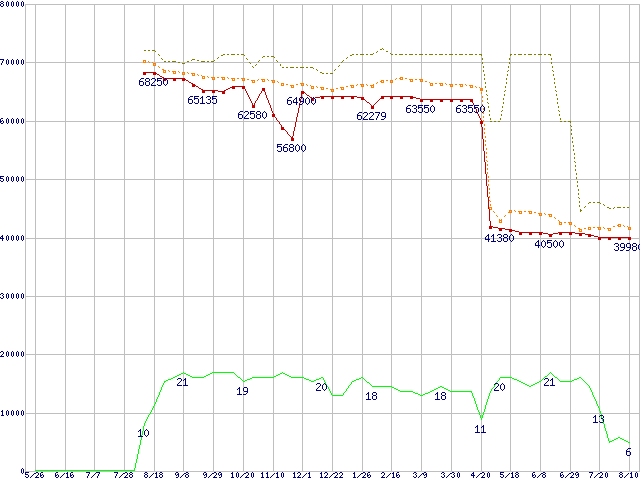 | Core 2 Duo E6700 (2.66GHz,L2 4MB)の価格推移 | | | (2006年5月26日~2007年8月10日) |