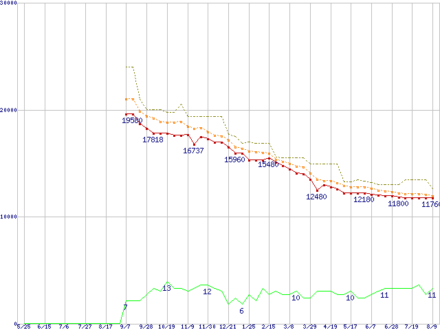 ※このグラフは過去のデータも税率5%相当に調整した税込み相当額のグラフです。 税率変更や、総額表示方式導入(2004年4月)の影響は除いています。 | | | ●凡例 | 最安値 (点線部は販売店未確認 または未調査) | 平均値 | 最高値 | ショップ数 |