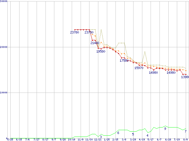 ※このグラフは過去のデータも税率5%相当に調整した税込み相当額のグラフです。 税率変更や、総額表示方式導入(2004年4月)の影響は除いています。 | | | ●凡例 | 最安値 (点線部は販売店未確認 または未調査) | 平均値 | 最高値 | ショップ数 |