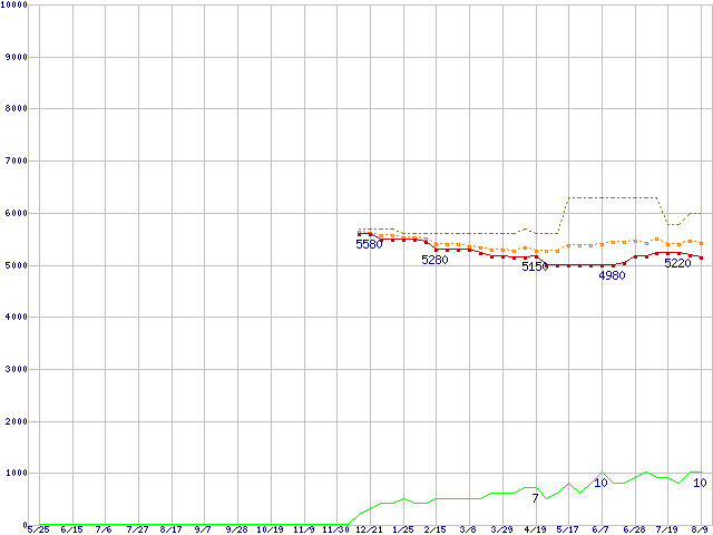 ※このグラフは過去のデータも税率5%相当に調整した税込み相当額のグラフです。 税率変更や、総額表示方式導入(2004年4月)の影響は除いています。 | | | ●凡例 | 最安値 (点線部は販売店未確認 または未調査) | 平均値 | 最高値 | ショップ数 |