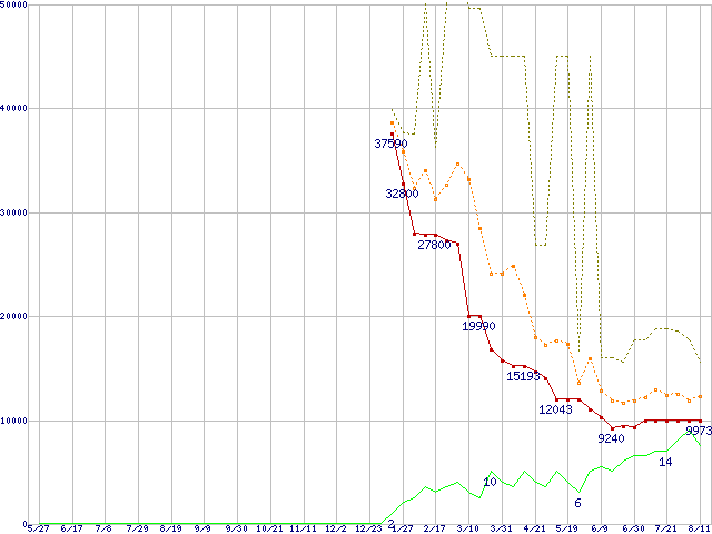 ※このグラフは過去のデータも税率5%相当に調整した税込み相当額のグラフです。 税率変更や、総額表示方式導入(2004年4月)の影響は除いています。 | | | ●凡例 | 最安値 (点線部は販売店未確認 または未調査) | 平均値 | 最高値 | ショップ数 |