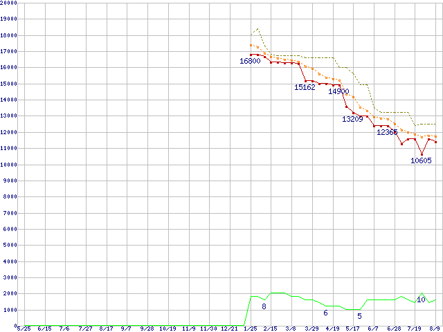 ※このグラフは過去のデータも税率5%相当に調整した税込み相当額のグラフです。 税率変更や、総額表示方式導入(2004年4月)の影響は除いています。 | | | ●凡例 | 最安値 (点線部は販売店未確認 または未調査) | 平均値 | 最高値 | ショップ数 |